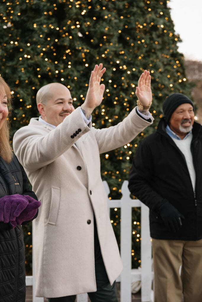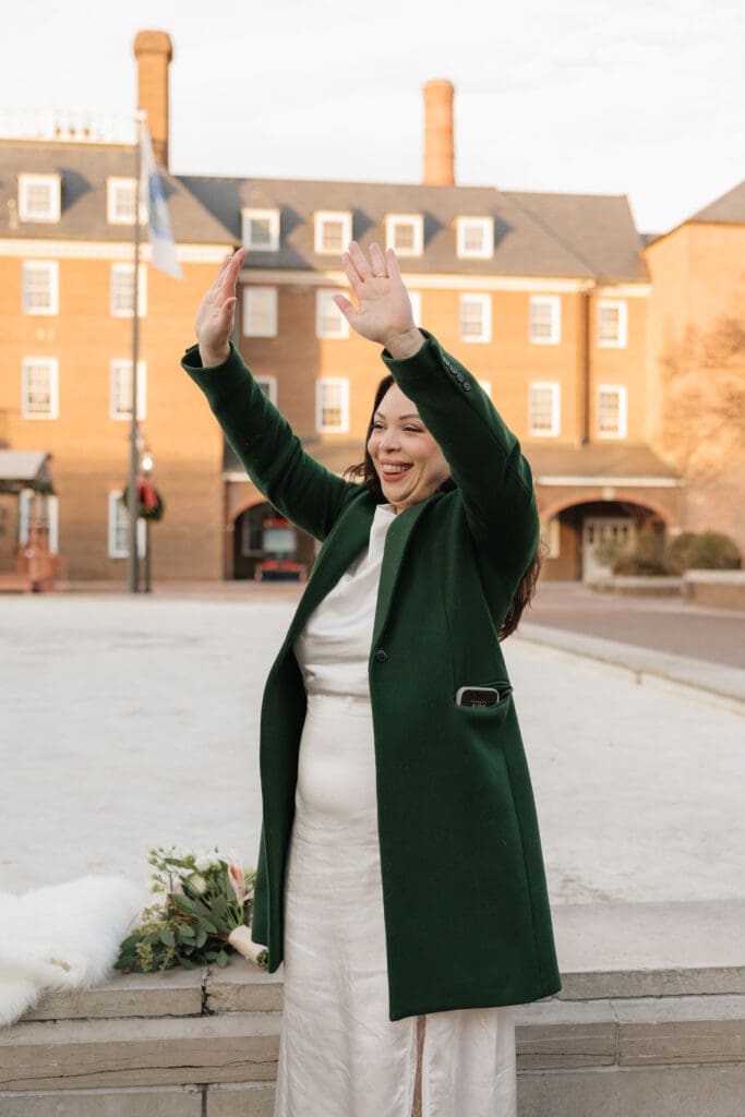 I met Noemi and Kyle beneath a giant Christmas tree brilliantly displayed in front of Alexandria City Hall on a mid-December afternoon. Noemi arrived in a stunning, full-length gown paired with a white fur stole. Beside her, Kyle sported a dark olive suit. There was a buzz of excitement between the two soon-to-be-newlyweds and the small gathering of immediate family members who came to witness their heartfelt elopement in Old Town Alexandria. Under the glow of the Christmas lights, Noemi and Kyle tied the knot with a deeply personal and meaningful ceremony. This was followed by happy tears, tight hugs, and an air high five shared between the new Mr. and Mrs. (in tribute to The Office, of course).